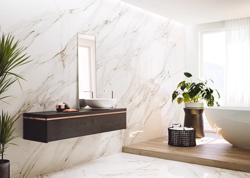 Inspirado en el mármol Apuano, un Calacatta con un veteado característico, se trata de un material con mucha personalidad. La serie Corinto de Coverlam destaca por su profundidad, lejos de superficies planas y simplificadas. Sobre una base de blanco puro, se desarrollan abundantes vetas con cambios tonales, que van desde grises azulados a óxidos rojizos
