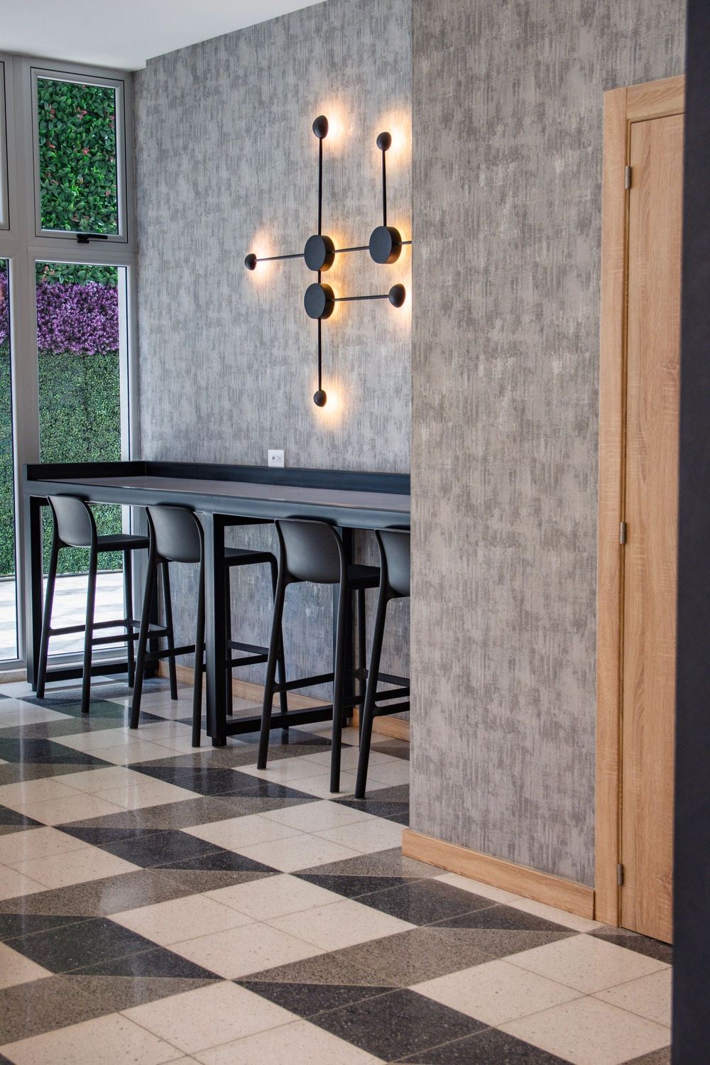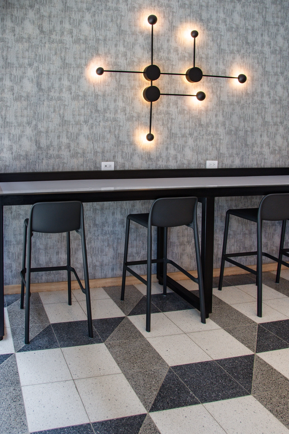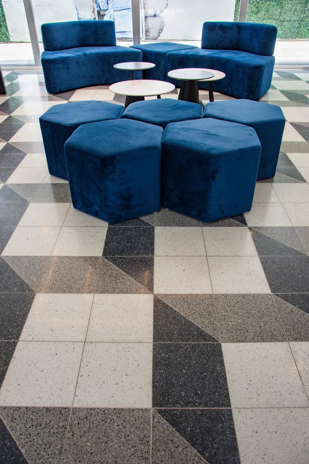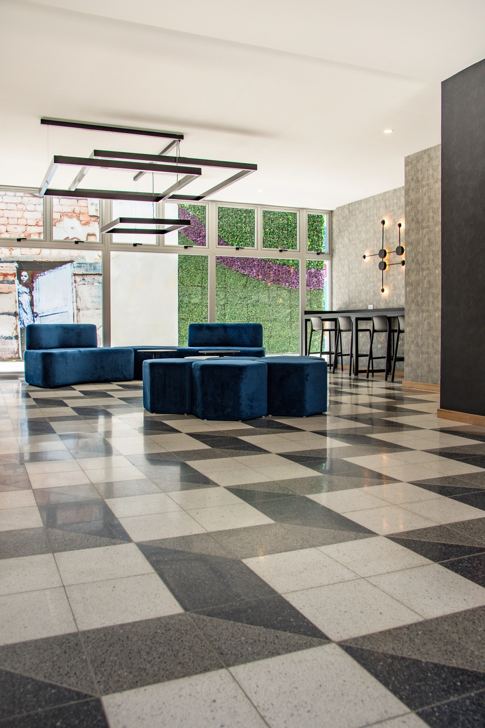 Es un proyecto innovador de uso mixto. Su ubicación estratégica permite conectividad con las zonas más importantes de la ciudad de Guatemala. En el diseño del libro se incluyó nuestro Granito Terrazo en formato 30x30cm con un patrón espectacular que forma un cubo (Negro N-32, Blanco Z-22 y Gris N-12).